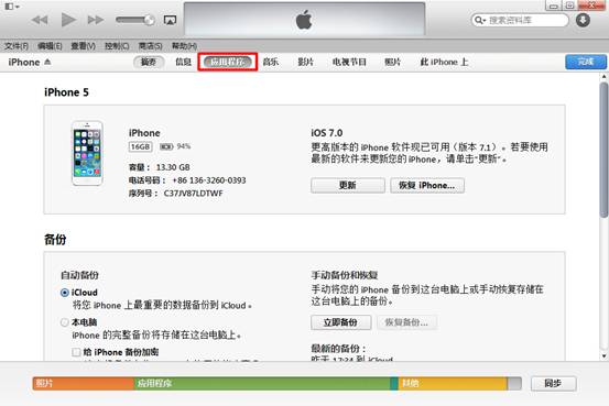 上步完成后,會進入如下界面,此處顯示一些你的iPhone的基本信息。在此選擇“應用程序”,下圖中紅框位置處。